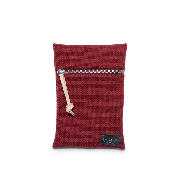 colour: cherry. size 13,5 x 20 cm (w x h). metal zipper with leather strap. outside 100 % wool. lining: always different, yet always beautiful, made of the leftover curtain fabric of De Ploeg.