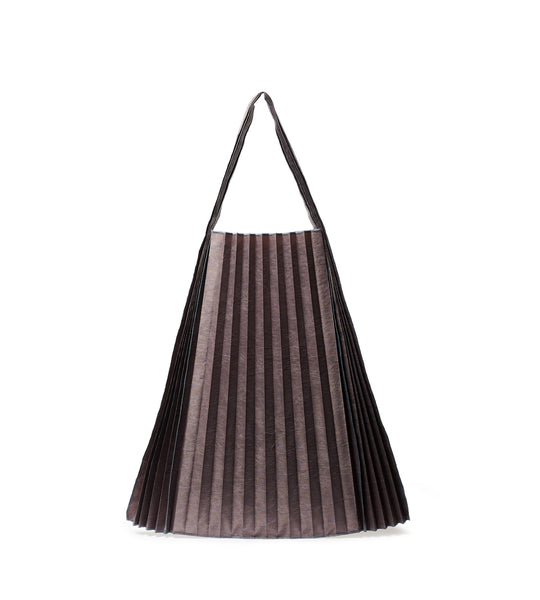 bag PLISSÉ L, design Nikki Giling. Crush fabric, soft and with subtle wrinkles. Colour taupe/soft brown. Size A4.